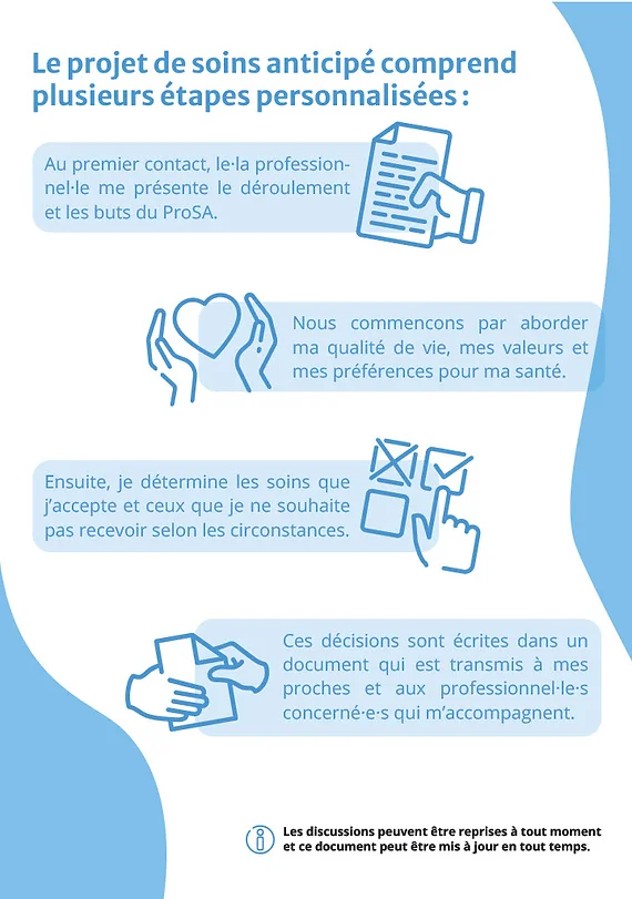 Le Projet anticipé des soins (PAS) vise à améliorer les opportunités pour le patient d’exercer son autonomie. Durant sa prise en charge et accompagné par un professionnel formé, le patient peut exprimer ses valeurs et volontés et définir un objectif de soins. Cet objectif de soins a pour but d’orienter sa prise en charge actuelle et celle qui adviendrait en cas d’incapacité de discernement ou d’urgence.